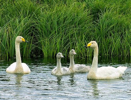 | ЛЕБЕДЬ-КЛИКУН (Cygnus cygnus) Отряд: Гусеобразные — Anseriformes. Семейство: Утиные — Anatidae. Статус: III категория. Редкий вид Смоленской области, встречающийся в небольшом количестве на ограниченных территориях в период сезонных миграций. Краткое описание: Самый крупный из лебедей. Основание клюва желтое, конец черный, граница желтого и черного цветов проходит под острым углом к плоскости клюва. Молодые птицы грязно-кирпичного цвета. Распространение: В нашей стране сплошной ареал простирается от Кольского полуострова до Камчатки. Южнее он носит островной характер. Вне СНГ: Западная Европа, Центральная Азия и остров Хоккайдо. На Смоленщине встречается в миграционный период, кроме того, на водохранилищах Гагаринского района нами отмечены летующие птицы. Места обитания: В лесотундре и таежной зоне излюбленными местами гнездования являются крупные водоемы, поросшие тростниково-рогозовой или осоковой растительностью. Чаще всего, это прибрежный бордюр тростника. Численность в природе: По ареалу в целом данных нет. На Смоленщине в весенне-осеннее время или летовках встречали до 5 птиц. Основные лимитирующие факторы: В прошлом практиковалась охота загоном линяющих птиц, что привело к катастрофическому падению численности кликуна. В настоящее время этот браконьерский способ добычи лебедей еще практикуется в Иране. Особенности биологии: Гнездо располагается среди тростника или рогоза и представляет собой небрежную платформу из прошлогодних надводных растений. Насиживает кладку только самка, а самец находится рядом на открытой воде.